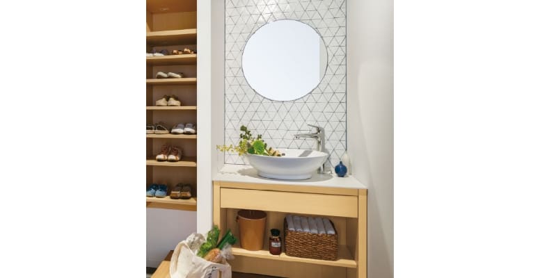 玄関に洗面を設置すると、帰ってきてすぐ手洗い、うがいができて衛生的です。