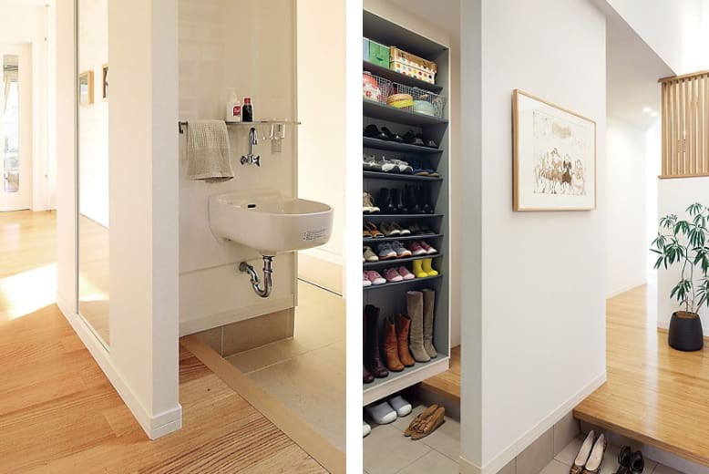 住まいの「顔」となる玄関はいつもすっきりさせておきたいですね。土間収納+裏動線で使い勝手が各段に良くなります。洗面を設けると帰宅後すぐに手洗いもできます。
