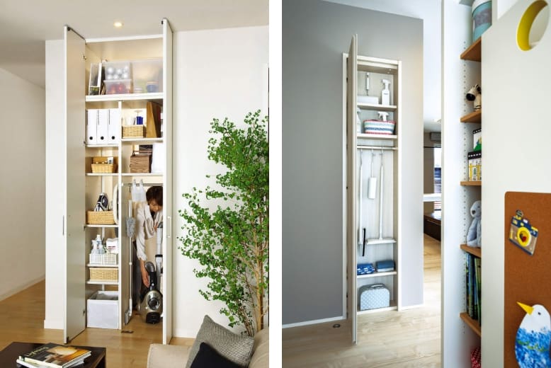 よく掃除をするリビングなどに、掃除道具用のクローゼットを(写真左)。また、家の壁厚を利用して各部屋・空間の省スペースに「ポケット収納」(写真右)を入れてみるのもおすすめ。