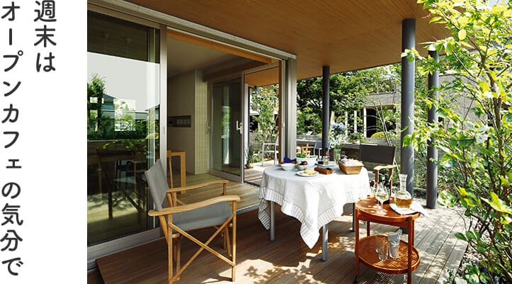 週末のブランチは、テーブルとチェアを軒下空間に並べて