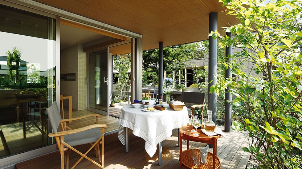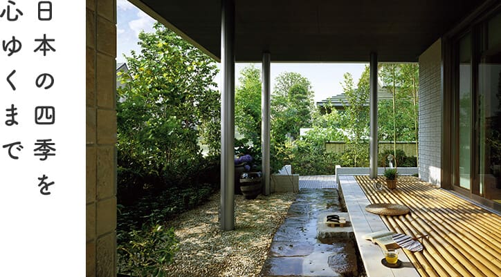 深い軒下空間はうちと外をつなぐ中間領域の役割を果たします。室内のようでいて屋外、だけど雨や日差しを気にしなくていい、そんな素敵な場所が出来上がります。