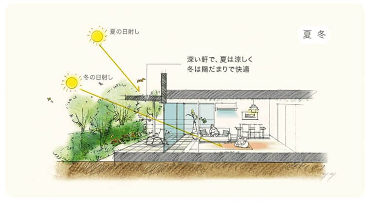 深い軒は、高い角度から照りつける夏の日差しをカット。一方で低い角度から優しくそそぐ冬の日差しを室内に取り入れて、一年を快適に過ごすことができます。