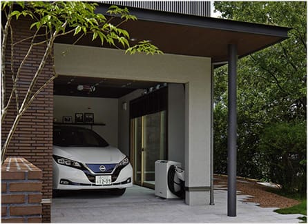 停電時に、車の電気を家庭の電源として使えるV2H機器を格納するスペースを確保。玄関脇には備蓄倉庫を設けているので、防災グッズや食料品などのストックが可能です。非常時には備蓄倉庫から物を取り出して、最短でガレージに出られる動線を確保しています。