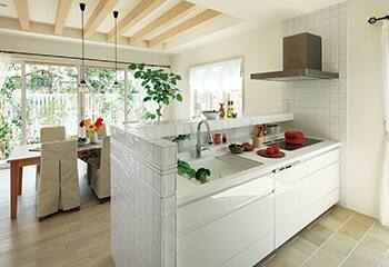 キッチンにちょっとした腰壁を設けることで、ダイニングやリビングからの視線をカット、調理台や流しのゴチャゴチャしたものを隠してくれます。対面キッチンでも安心のひと工夫です。