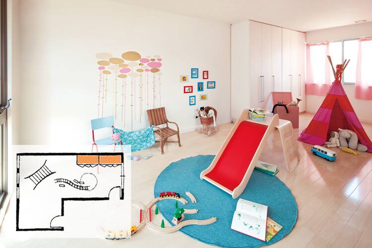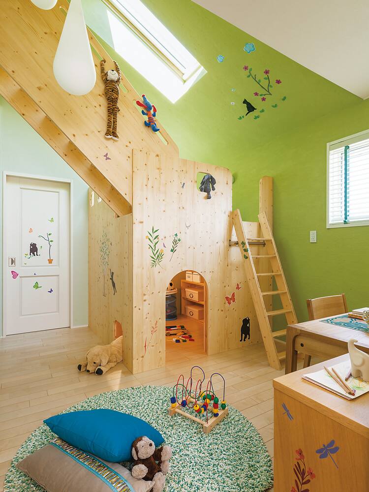 ロフトや階段を組み合わせた遊び心のある空間。壁を好きな色でペイントしたり、ウォールステッカーで飾ったり。子ども時代を思いっきり楽しむキッズルームです。