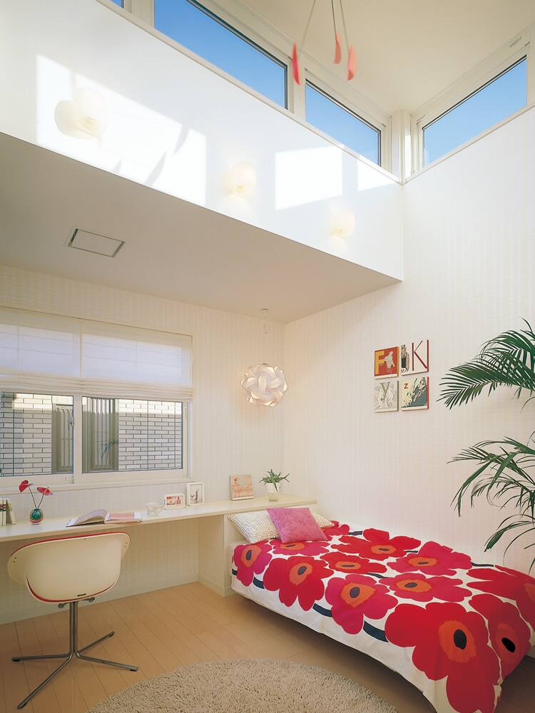 天窓とロフトのある子ども部屋。大きな飾り棚には、その時々のお気に入りや思い出のものを飾って。ベースはシンプルな空間なので、成長に合わせた変化も楽しみです。