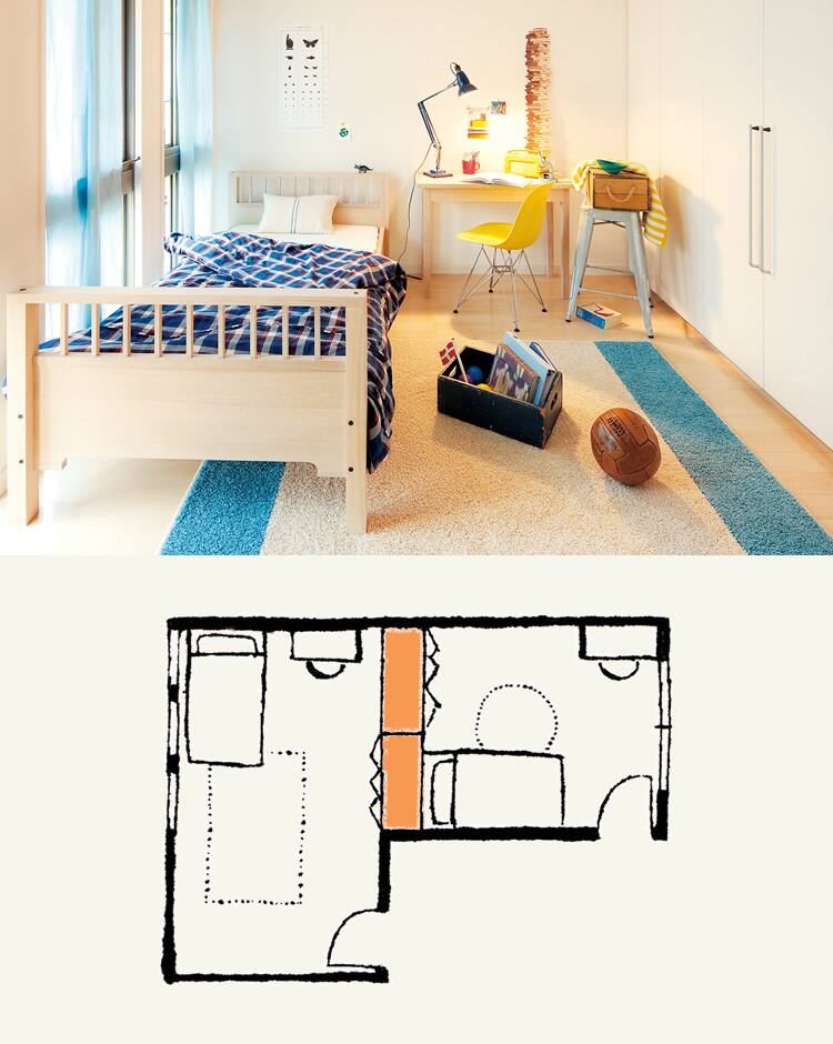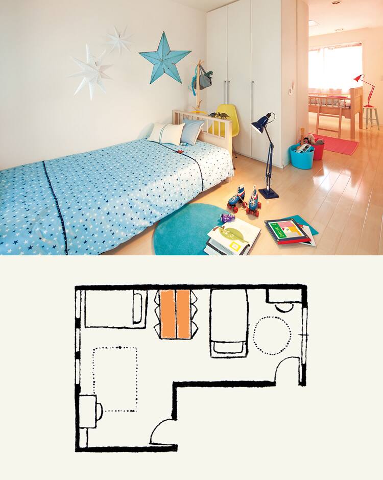 小さい時にはきょうだいで一緒に遊んでいた空間も、児童期になると、それぞれの空間も尊重しつつ、きょうだいのつながりを大切にしたセミオープンの個室に。