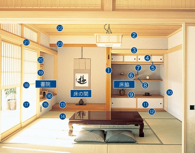 お客さまを正式に迎えるための格式高いスタイル。床の間と違い棚のある床脇、付書院を備えています。
