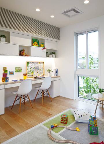 親子でお金について話し合ったり、子どもたちが家族の気配を感じながら学びに没頭できるのが、ファミリーライブラリーの魅力。横並びのデスクは親近感を生み、互いに協力しあって学びを深められる上、居心地のいい椅子やテーブルを置けば、くつろぎ感のある家族空間としても大活躍してくれます。