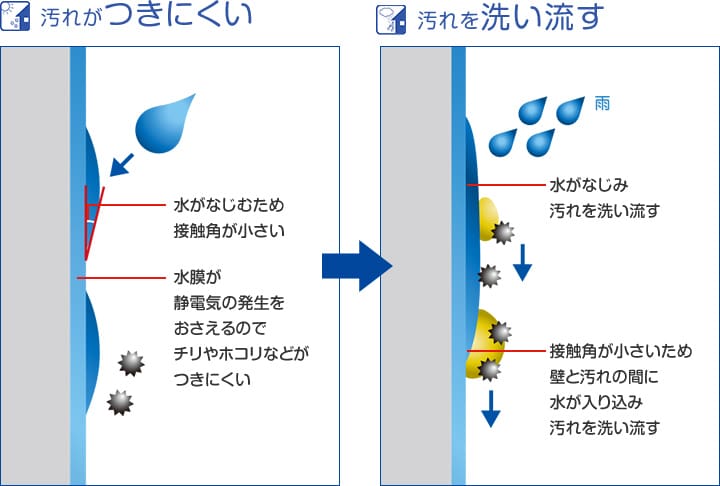 また、外壁表面に薄い水の膜をつくる「防汚塗装」の外壁では静電気の発生が抑えられ、汚れの付着を大きく軽減。さらに雨が降ると、付着した汚れ物質と外壁の間に雨水が入り込み、汚れを浮き上がらせて洗い流すセルフクリーニング効果を発揮。雨が多い梅雨の季節がちょっとうれしくなる機能ですね!
