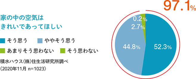 直近の調査データでは、住まいの中の空気はきれいであってほしいと回答したひとが97.1%。空気の清潔さに対する意識が高いことがわかります。住宅における「新しい生活様式」への対応がますます重要になっています!