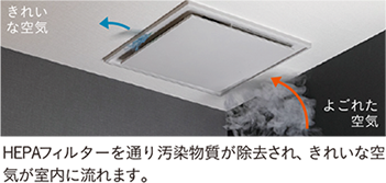 インテリアの邪魔をしない天井付きビルトイン空気清浄機。スマート イクスでは「アメニティ換気システムIV」と一緒に使用することで、一般的な換気だけのときよりも最大約5倍、素早く空気中の汚染物質を除去します。
