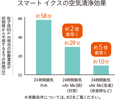Me:FL+2000mm程度に設置 実験室にタバコの煙(粒子径0.5μm相当)を充満させた後、換気またはAir