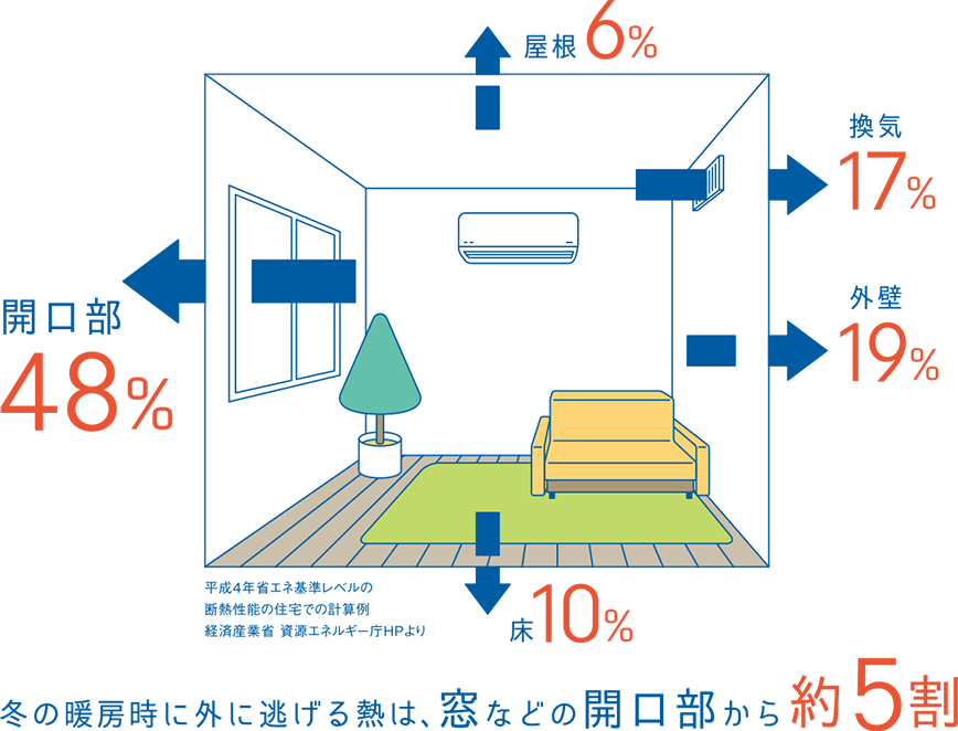 冬の暖房時に室内から外に逃げる熱の約5割が、窓をはじめとした開口部を通っていることがわかりました。しかも、その中で少なくない影響を与えているのが、サッシや枠といったガラス以外の部分。そこで積水ハウスはハウスメーカーでありながら、窓メーカー顔負けの独自サッシを開発。日本のどこでも一年中快適な住まいを実現させています。