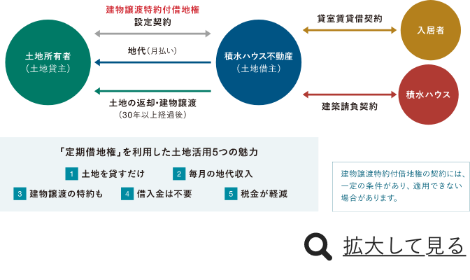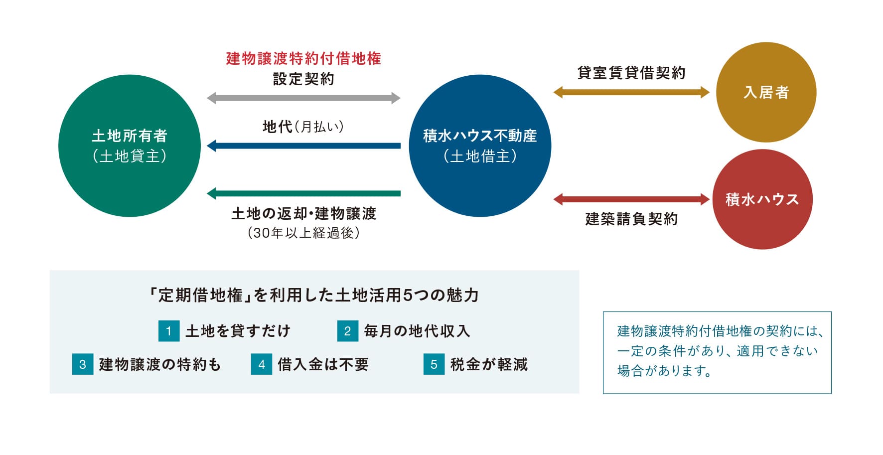 積水ハウス不動産が借主となる場合「建物譲渡特約付借地権※」をご提案することも。定期借地権の一種で、お借りした土地に積水ハウス不動産が賃貸住宅を建築し、管理運営も行います。土地オーナー様は建築費用の負担がないので、自己資金や借入金が不要。更に建物の管理業務などの手間もかかりません。また、一定期間、地代として毎月安定した収入を得ることができ、固定資産税や相続税の軽減にもつながります。