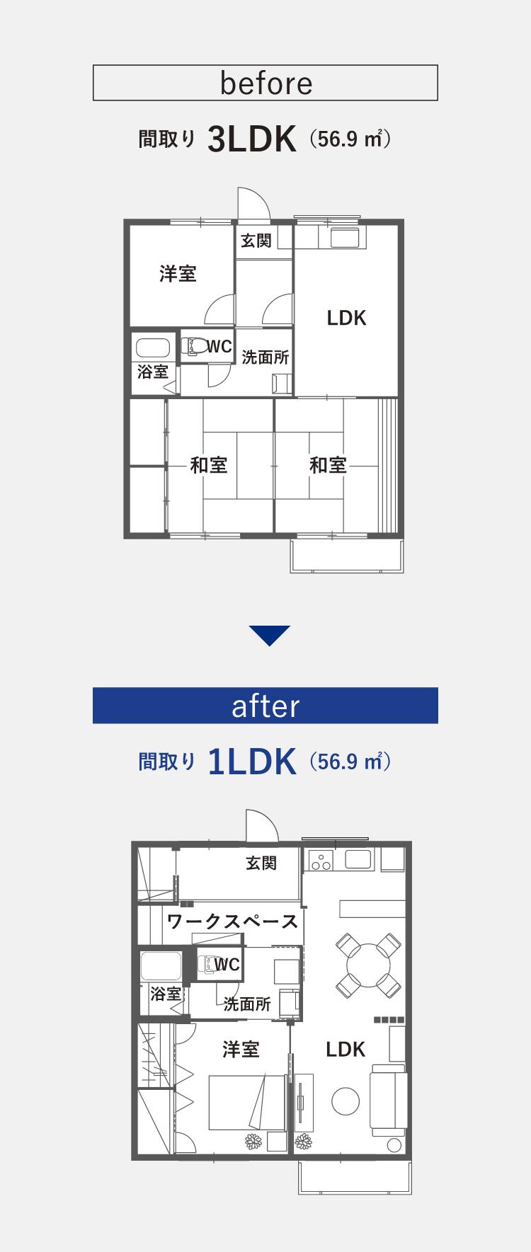 3DKの間取りを1LDKに一新 - ◎ 玄関と洋室の間の壁を外して、仕事や趣味に