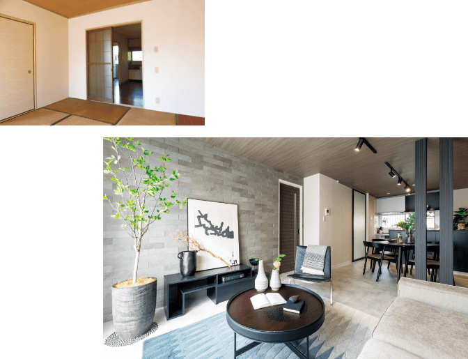 和室とDKの間の壁を取り払い、14.1畳の広々したLDKを実現。(写真左:before、右:after)