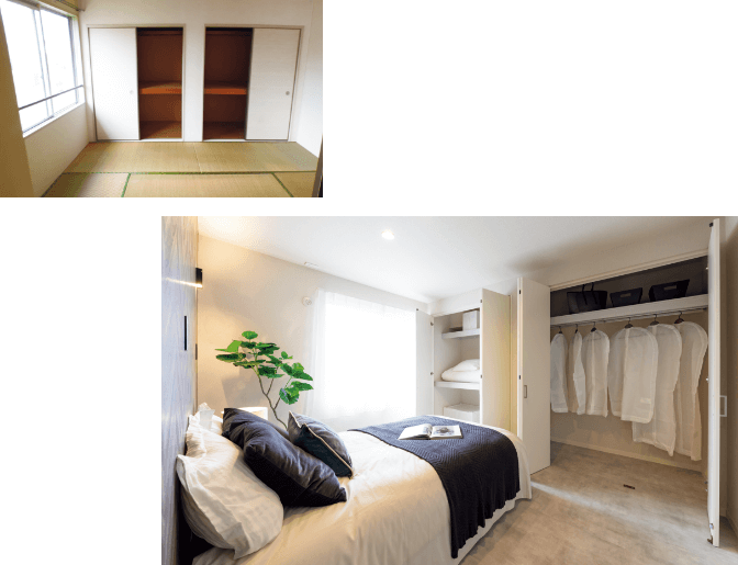 和室の押入れは、大容量で使いやすいクローゼットに。(写真左:before、右:after)