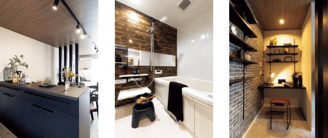 キッチンとリビング・ダイニング の間に設けたカウンターはパントリーとしても活躍。(写真左)ダウンライトが空間に広がりを感じさせるバスルーム。(写真中央)ワークスペースの壁には、趣味の道具などを置ける棚を造作。(写真右)