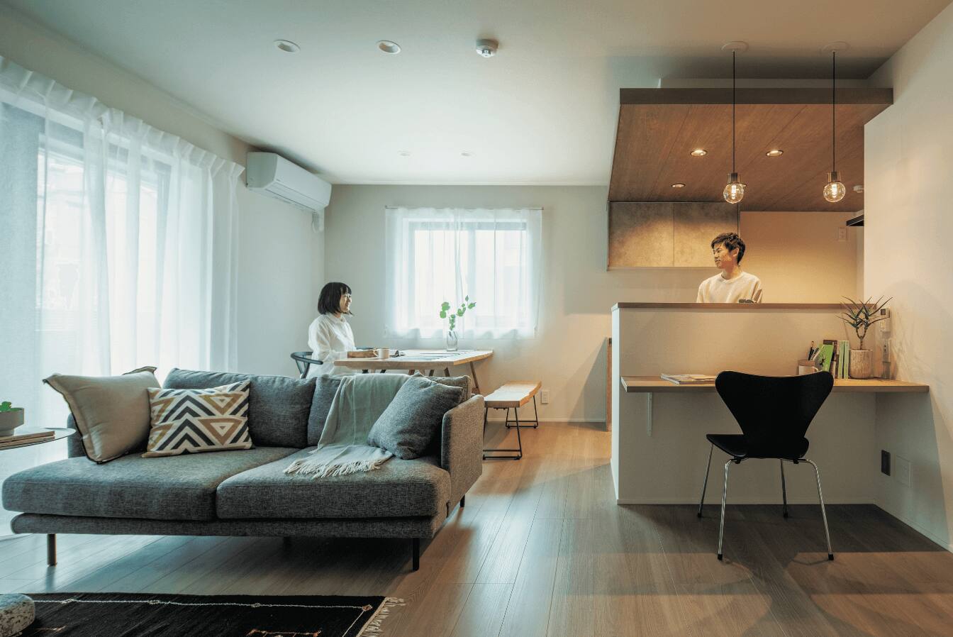 家族が緩やかにつながる広々としたLDK。キッチン前には家事や仕事などマルチに使えるワークスペースも。