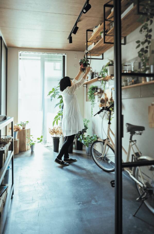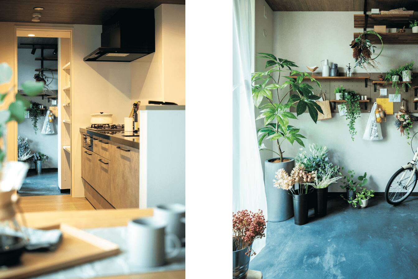 玄関から続く土間スペースは、グリーンを育てるなど、自分らしい暮らしが叶う贅沢な空間に。