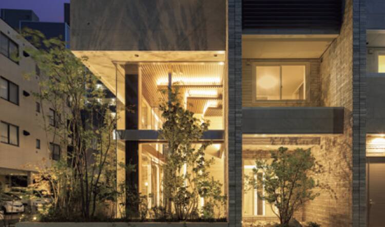 この建物を象徴する2層吹き抜けの共用ラウンジは、北東の角にガラス張りのカーテンウォールを配し、夜になるとあたたかな光が街へとこぼれます。上に行く程に広がる吹き抜けは、オーナー様が経営される会社の繁栄を願ってデザインしています。共用空間にしつらえた飾り棚には、近隣にある美術館を想起させるオブジェを設置。オーナー様の想いをデザインで表現したいと、随所にこだわりました。