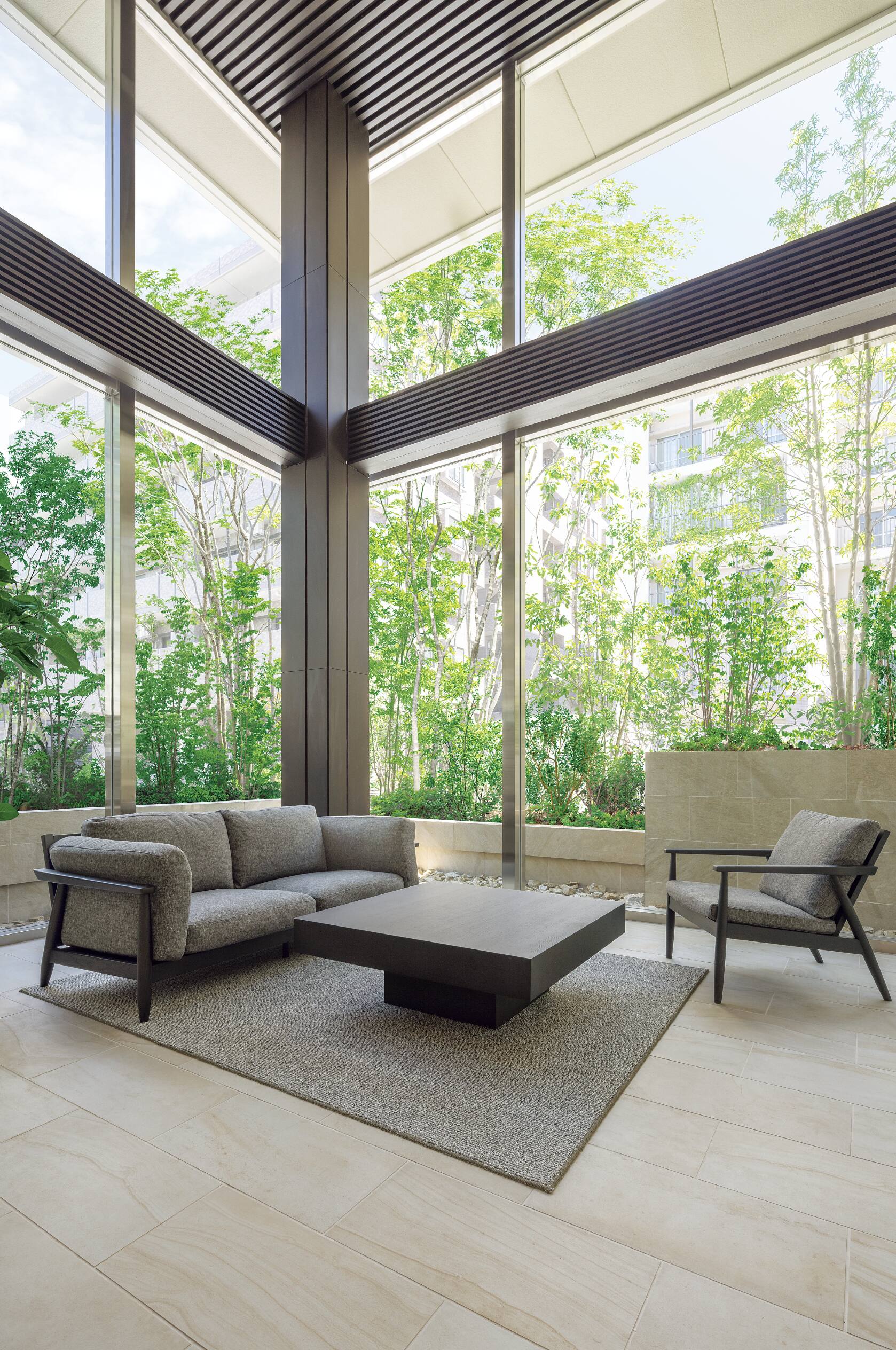 角地を活かした全面ガラス張りの共用ラウンジ。窓の外に豊かな植栽を設けることで、さりげなく外の視線を遮る工夫が施されている。