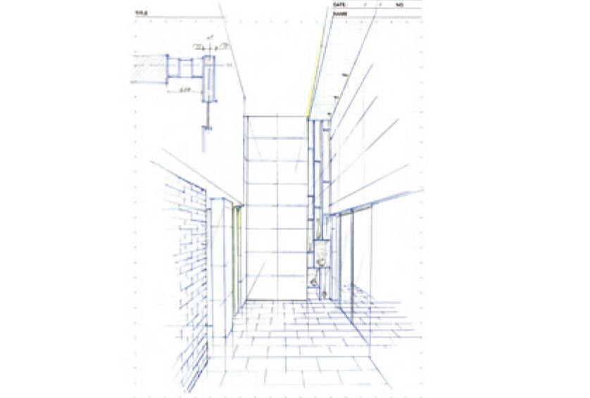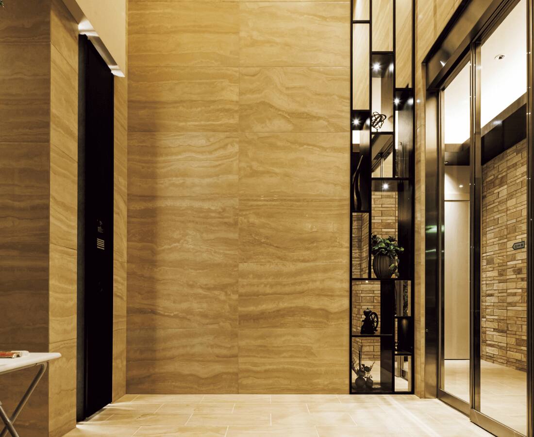 この建物を象徴する2層吹き抜けの共用ラウンジは、北東の角にガラス張りのカーテンウォールを配し、夜になるとあたたかな光が街へとこぼれます。上に行く程に広がる吹き抜けは、オーナー様が経営される会社の繁栄を願ってデザインしています。共用空間にしつらえた飾り棚には、近隣にある美術館を想起させるオブジェを設置。オーナー様の想いをデザインで表現したいと、随所にこだわりました。