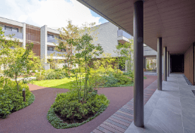 建物の内側に取り入れたのは、入居者同士のコミュニティーを育む視点。プライバシーに配慮しながらも緑と触れ合える中庭は、のびのびと遊ぶ子どもたちを見守る大人同士にも、自然と会話が生まれるような緩やかにつながる場として設計されています。