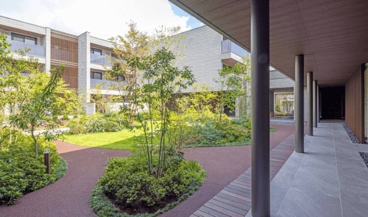 入居者同士の憩いの場となる、緑あふれる中庭。
