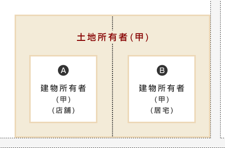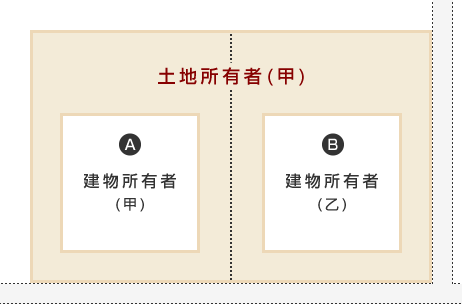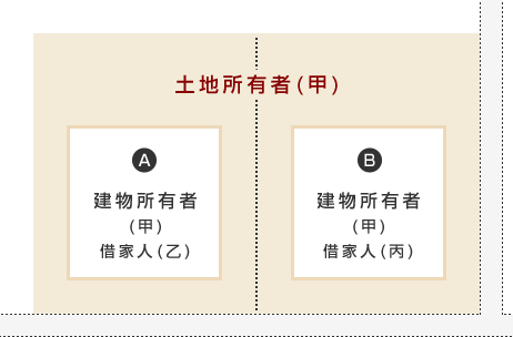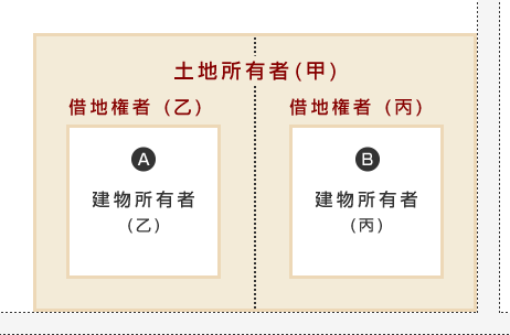 (4)借地権の目的となっている宅地を評価する場合において、貸付先が複数であるときには、同一人に貸し付けられている部分ごとに1画地の宅地とします。 A、B土地には、ともに他人の権利(借地権)が存し、いずれも貸宅地として利用していますが、異なる者の権利の対象となっている(借地権者が異なる)ことから、利用の単位が異なると認められるため、別個に評価します。 ![]() |