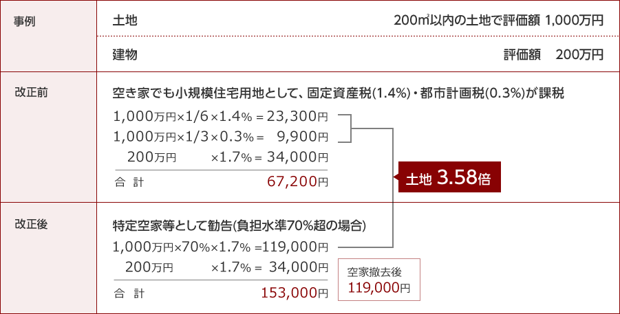 特定空家等又は管理不全空家等として勧告の対象となると、たとえ建物が建っていても住宅用地にかかる固定資産税及び都市計画税の課税標準の特例対象から除外されます。住宅用地の特例が適用されている200m²以内の敷地で、その固定資産税評価額が1,000万円の場合、固定資産税額・都市計画税額の合計は33,200円となります。これが、特定空家等又は管理不全空家等として勧告の対象となると、固定資産税額・都市計画税額の合計は119,000円となり、なんと約3.6倍となります。しかも建物を取り壊さなければ、空き家である建物に対しても従来どおり固定資産税・都市計画税がかかります。