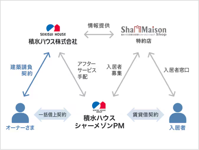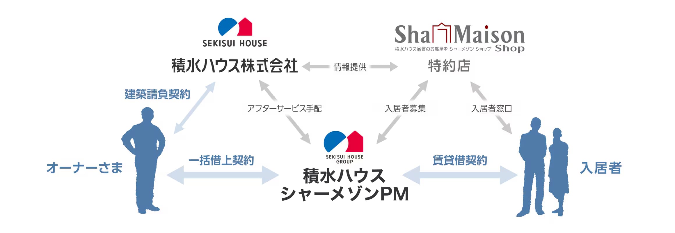 積水ハウスは、積水ハウスシャーメゾンPM各社と一体となり、入居者募集から、一括借上、建物の維持管理まで賃貸経営のすべてをサポート。