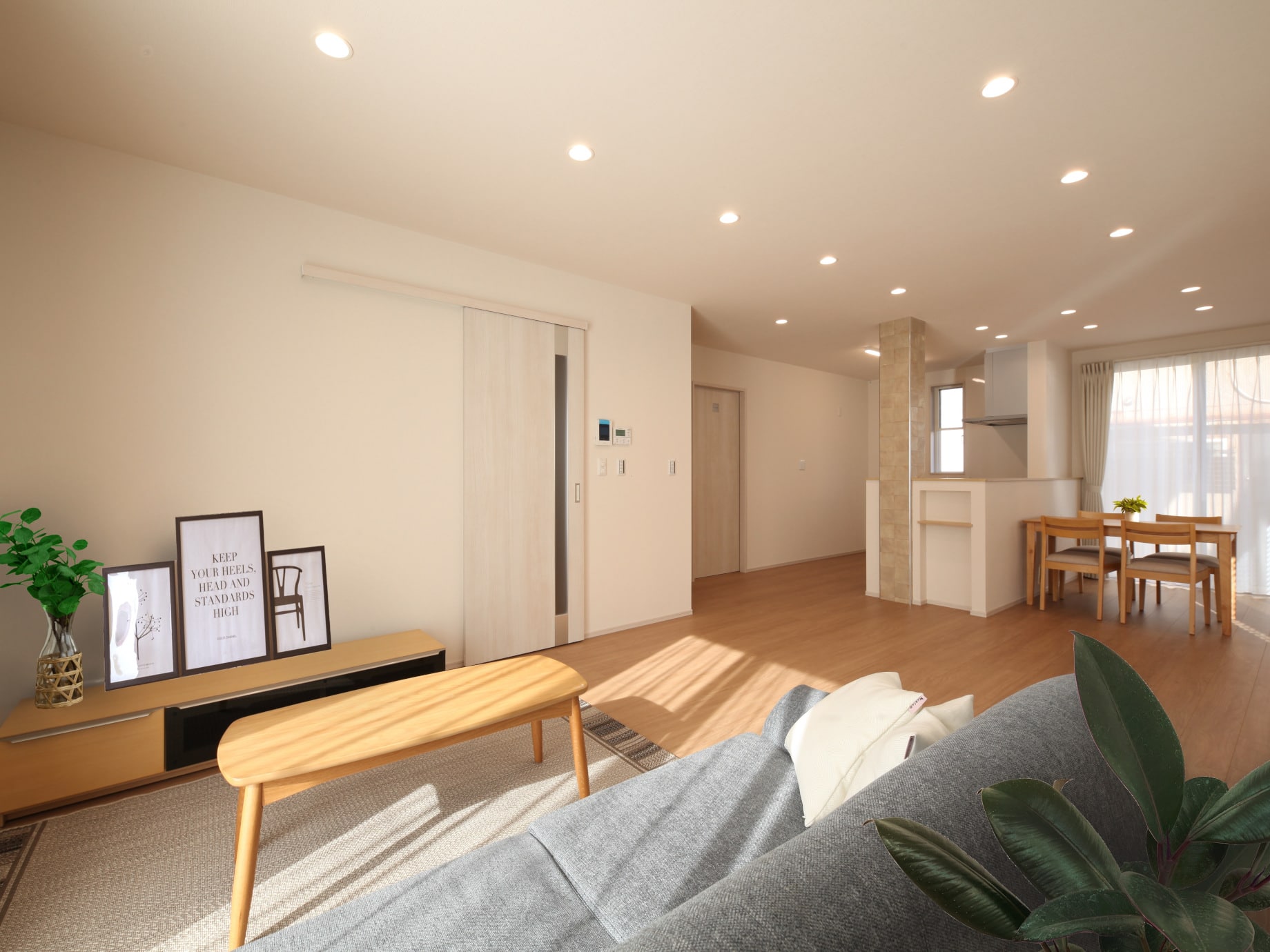 リビング、ダイニングの掃き出し窓からは暖かな光が入り、