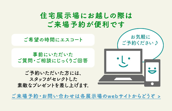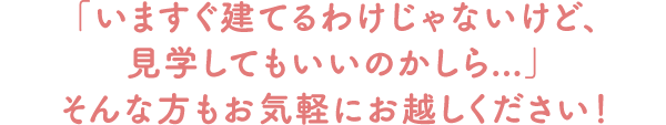 来場予約をしておくと、決めた時間にスタッフが案内してくれるので忙しい方にもオススメ。事前に質問を送っておくこともできるので、ぜひ活用して見学を有意義な時間にしましょう。建設予定はまだまだ先、という方も遠慮なく。モデルハウスは住まいづくりの勉強に役立てるための場所です。気軽に相談しても大丈夫。