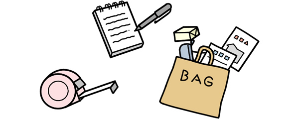 持ち物は、筆記用具、メジャー(巻尺)、そしてカタログやパンフレット等を持ち帰るためのエコバッグがあると便利です。たくさん見た後では記憶が曖昧になりがちなので、メモを取る際は感想や寸法などと一緒に、展示場名・メーカー名を書いておくのも忘れずに。廊下の幅や収納など、寸法を測ることで空間感覚が数値化され、住まいづくりの際にとても役立ちます。