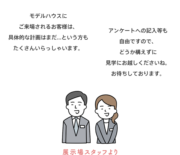 わからないことや詳しく知りたいことはスタッフにどんどん質問しましょう。構造や素材のこと、土地に関する情報、ローンや税金のこと、住んでからのメンテナンスのこと...住まいづくりに関することならなんでも相談できます。