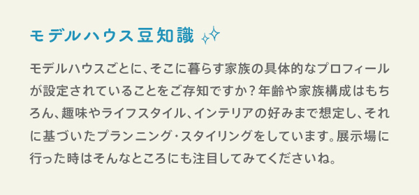 モデルハウスには、毎日の暮らしを快適にするための様々なアイデアが詰まっています。キッチンの使い勝手、生活動線、収納、etc... ご自身の暮らし方のスタイルと照らし合わせながら見ていくことで、自分にとっての暮らしやすさのヒントが見えてきます。
