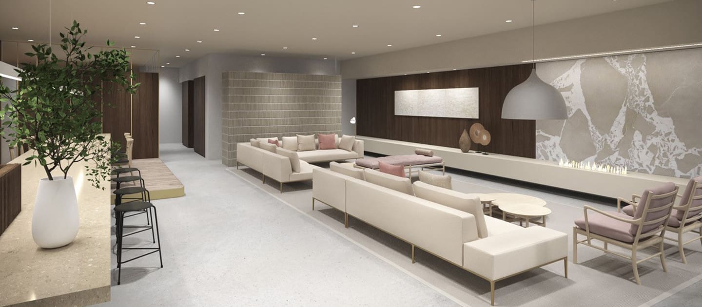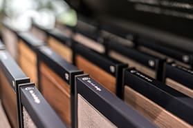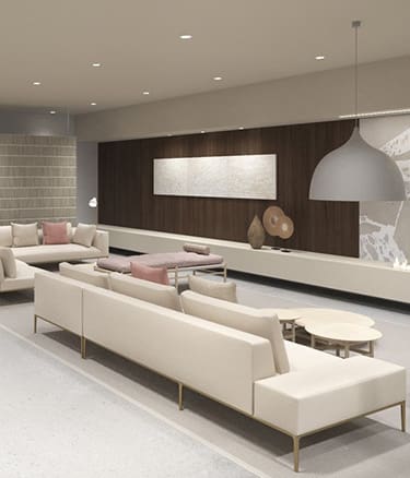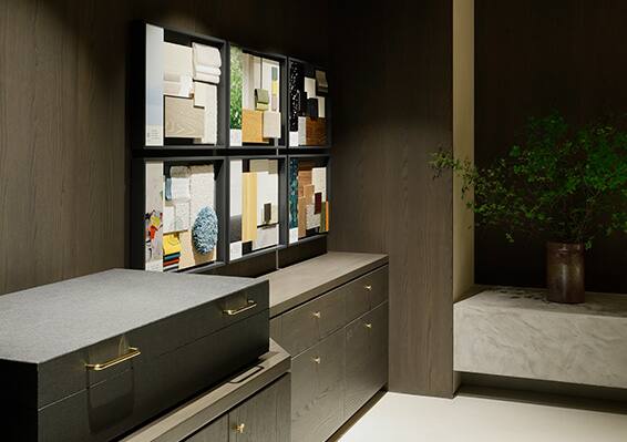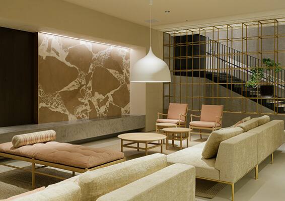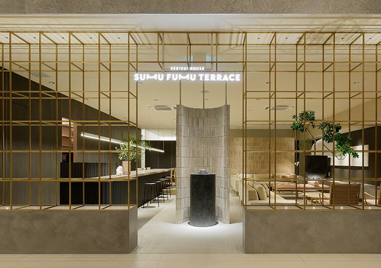 トーンを合わせた異素材を使用し、上品な空気が漂うオープンラウンジ。コーヒーを飲みながら、リラックスして住まいづくりのヒントを集めることができます。